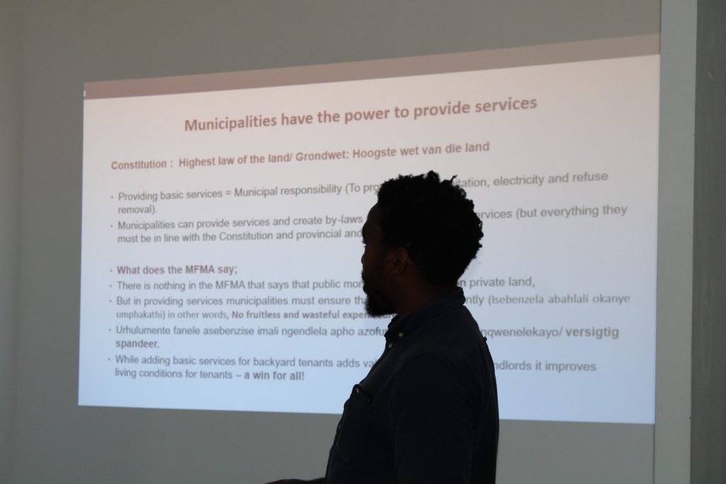 So, ‘Is it legal for government to say we cannot put services in privately owned properties?’ This question and many others were unpacked during the workshop through examination of the South African Constitution and other relevant Acts. And in the case of this question, the answer was a clear “no.” We need to continue to advocate for the provision of basic services to backyarders living on both public and private land across our cities, and the state has a responsibility to respond to the urgent service needs of these residents.