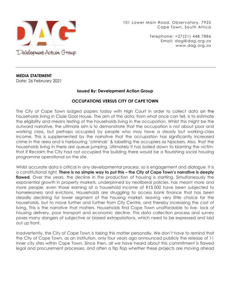 MEDIA STATEMENTDate: 26 February 2021 Issued By: Development Action Group OCCUPATIONS VERSUS CITY OF CAPE TOWN The City of Cape Town lodged papers today with High Court in order to collect data on the households living in Cissie Gool House. The aim of the data, from what once can tell, is to estimate the eligibility […]